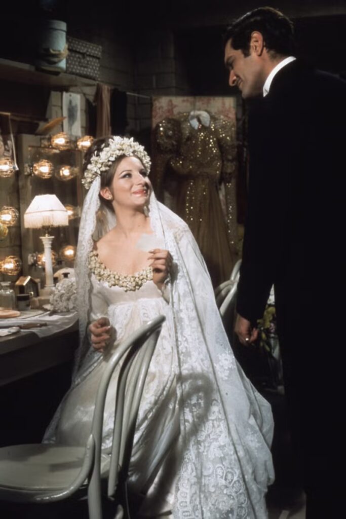 We didn’t technically see what Fanny Brice wore to say “I do” to the dashing Nick Arnstein, but Barbra Streisand was wearing an absolutely gorgeous wedding gown for her performance with the Ziegfeld Follies when the two characters fell in love.